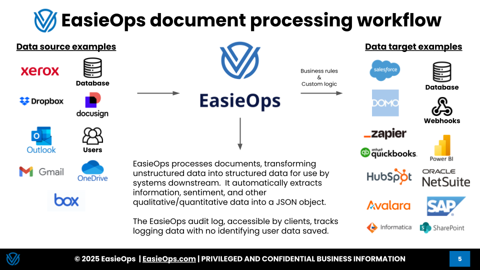 EasieOps is currently in use across multiple industries, including insurance for compliance analysis, nonprofits for grant and legislation review and by university researchers for historical document analysis. The software integrates with existing enterprise applications through an API, allowing businesses to automate workflows without process disruption.